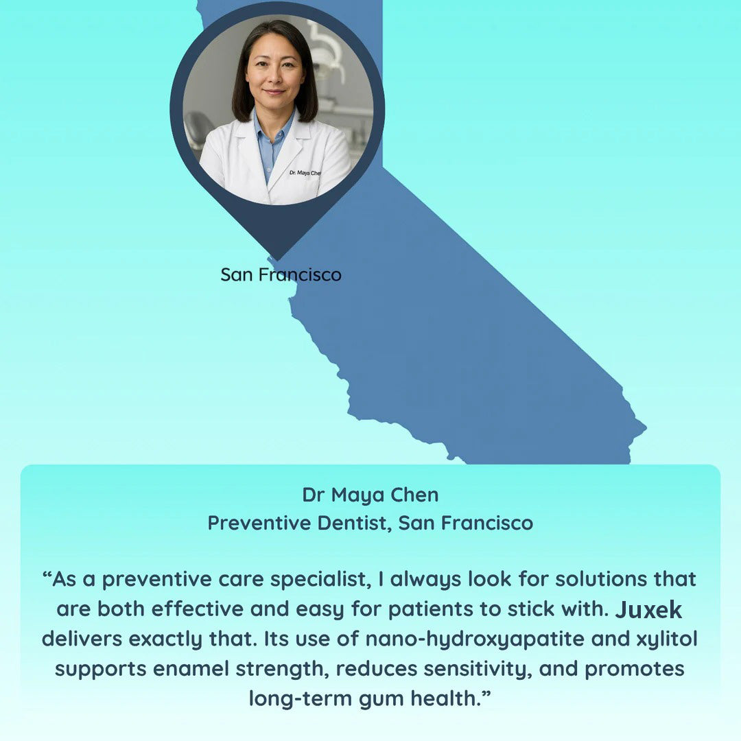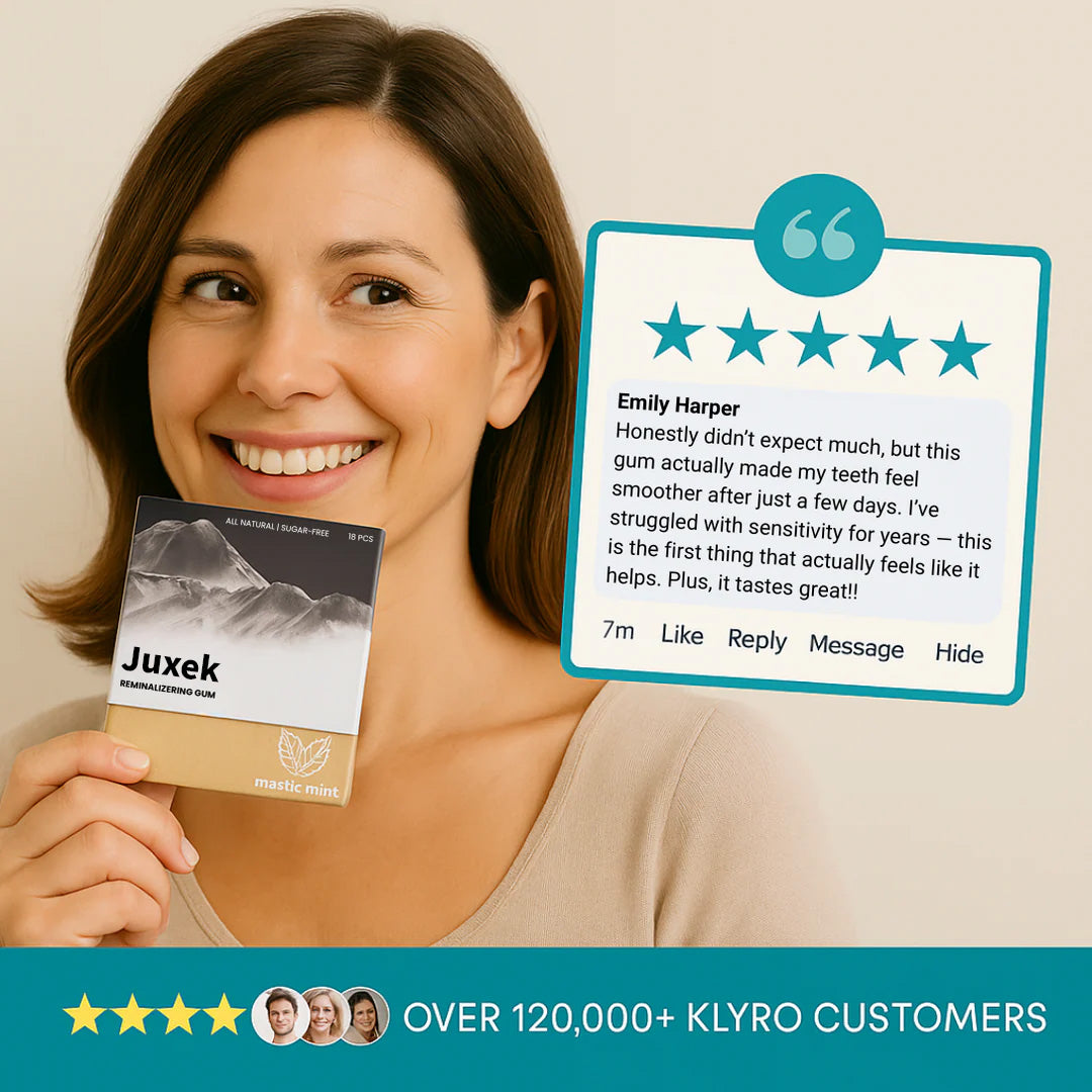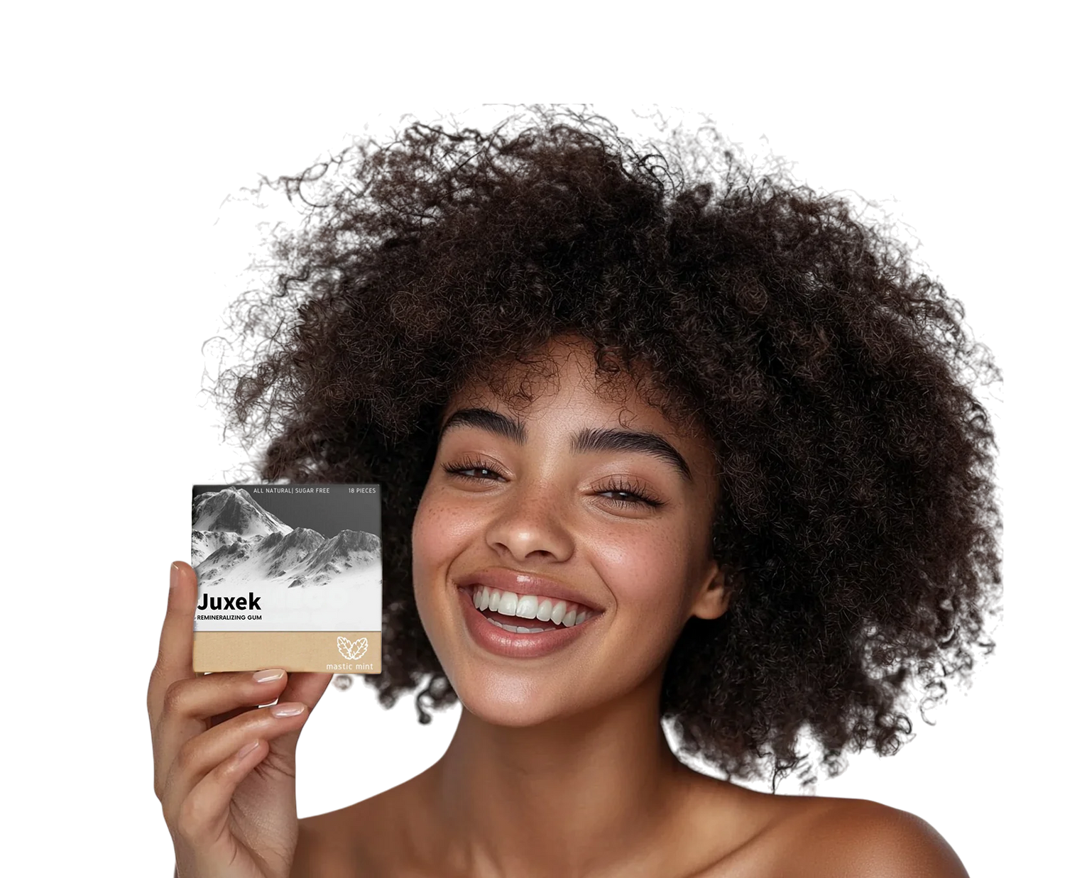 Juxek™ Remineralizing Gum was developed by dental experts to target the root cause of cavities, sensitivity, and enamel erosion — mineral loss and oral bacteria — so you can restore your smile naturally without harsh chemicals, fluoride, or expensive treatments.
