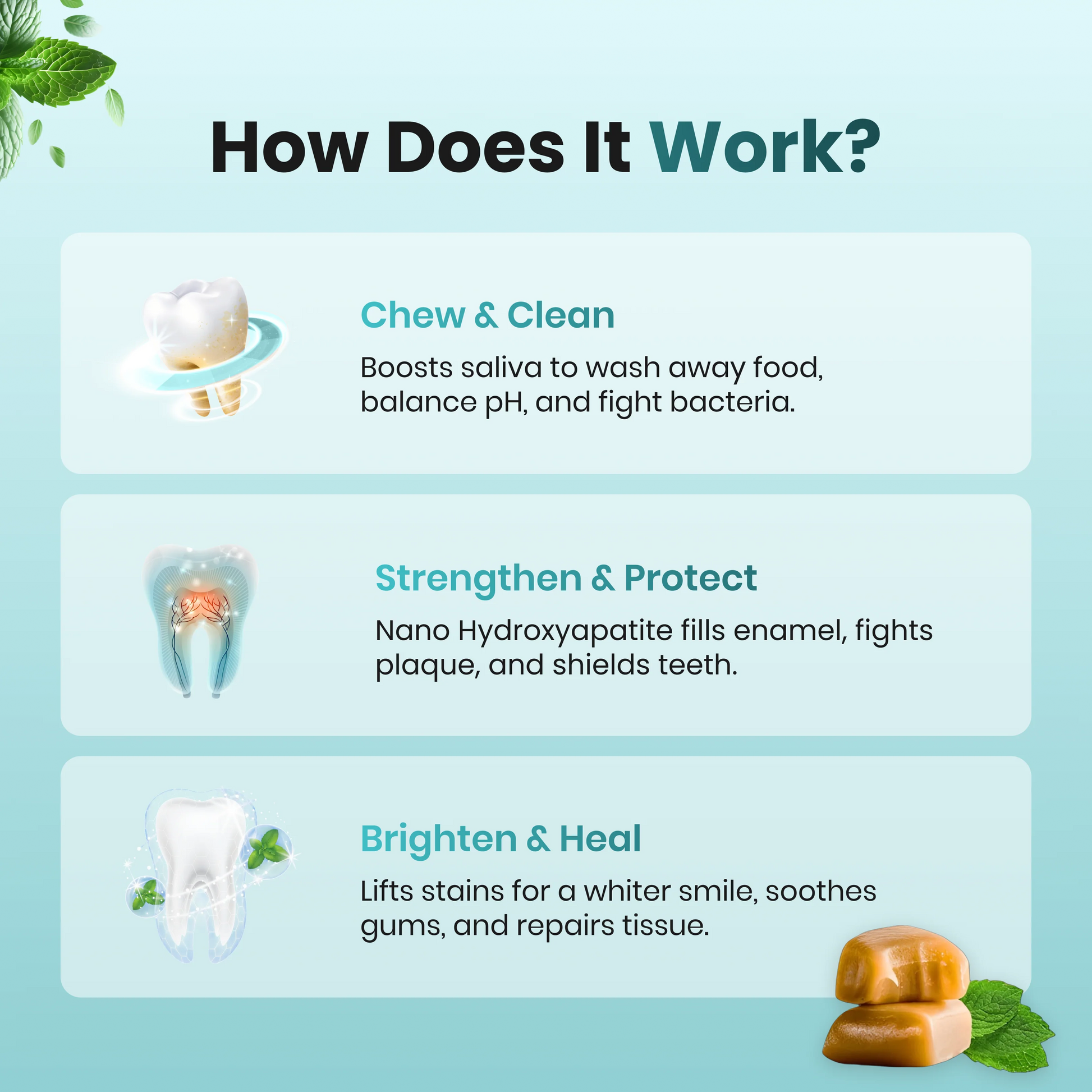 Its convenient chewable formula works anytime, anywhere — it strengthens enamel, whitens teeth, and freshens breath in just minutes a day, with no rinse, brushing, or effort required.
